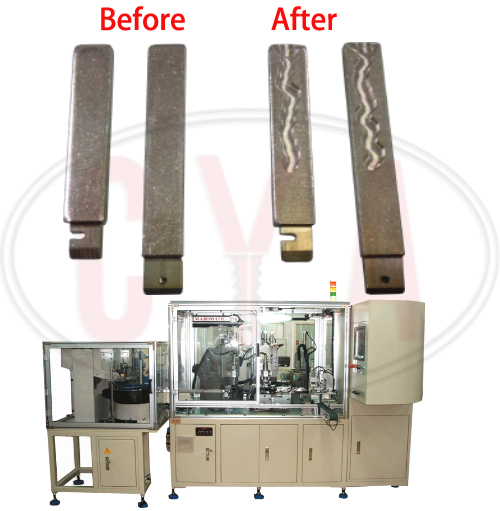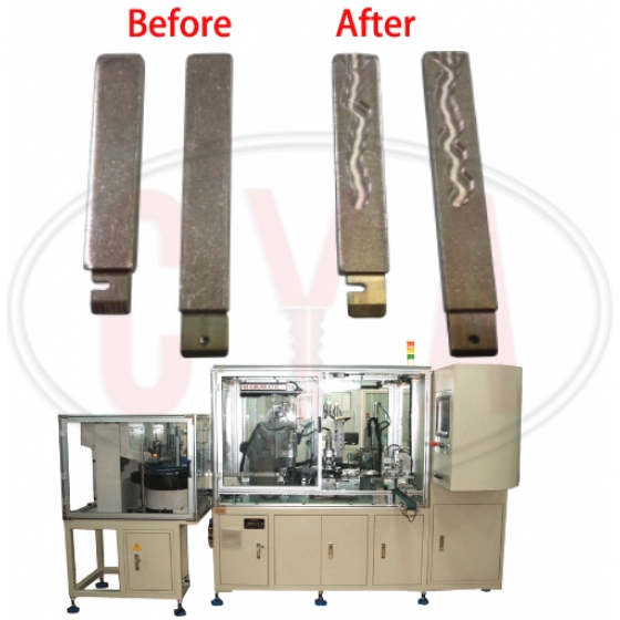 Wave key bitting machines mill the required code “snake” groove into both sides of the key blade. Different key blanks can be automatically loaded into the nest checked by CCD camera for correct key types. Two spindles, each attached to an XYZ servo system, simultaneously mills the groove on both sides of the key. A pneumatic single-point marker adds the code number to the key. The keys are measured, de-burred, and unloaded. Depending on requirements, keys may be ringed and/or dropped into bags. A magazine stacker or a vibratory feeder bowl with hopper automatically feeds the key blanks.