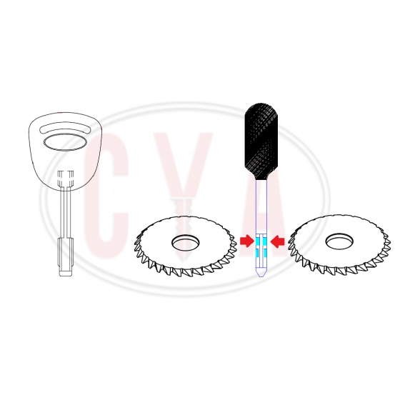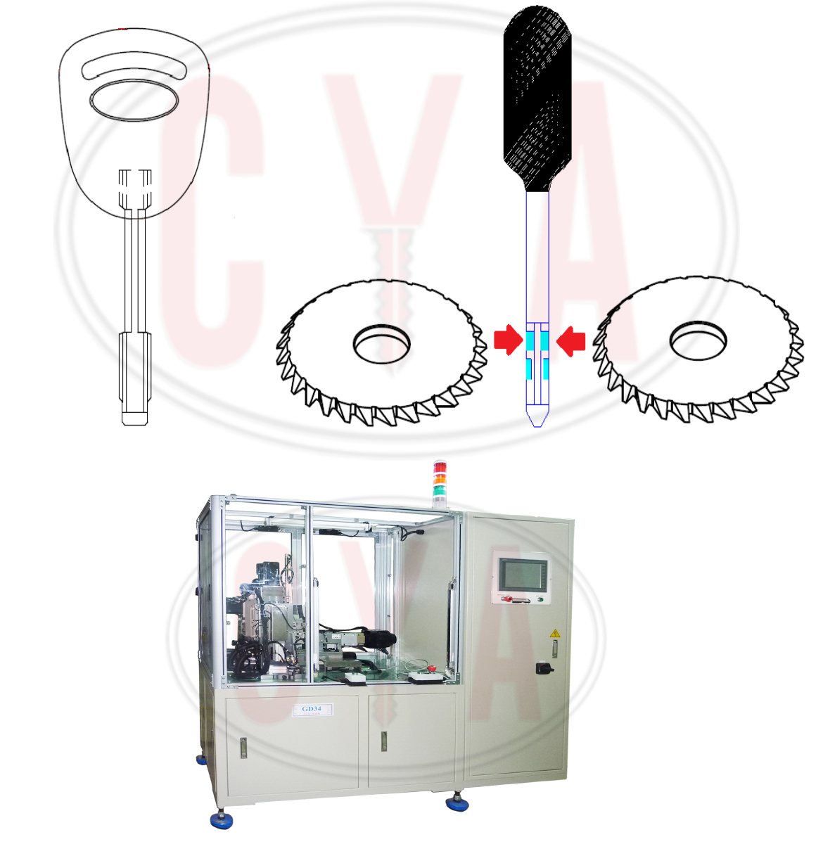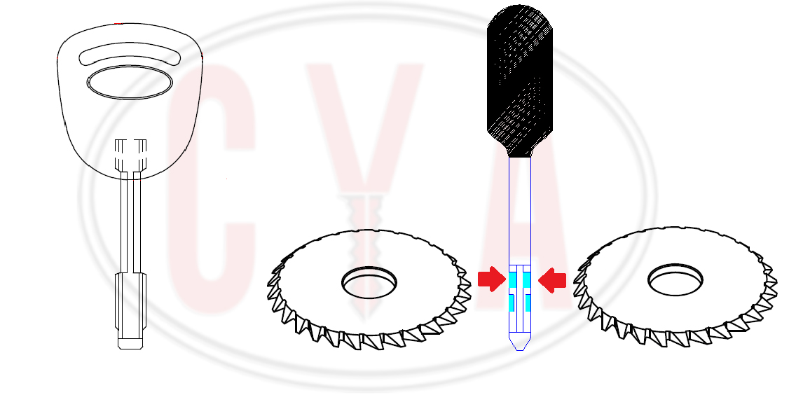 TB key bitting machines have two cutters that mill the correct flats at the required angle and location along the key blade. An operator manually loads the key blanks into a nest attached to a rotating servo system and presses 2 buttons by 2 hands to start milling. 2 cutters’ mechanisms will do the pitch moving and the key code angle biting.