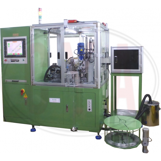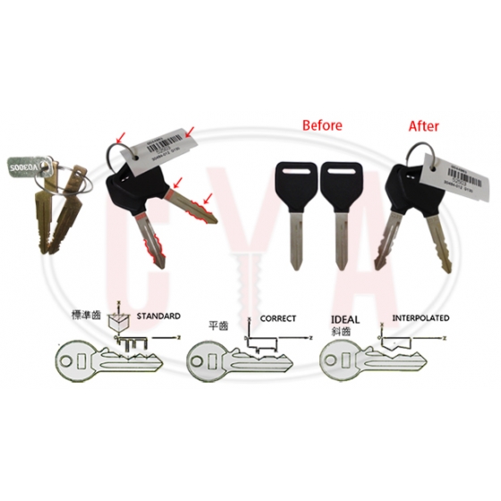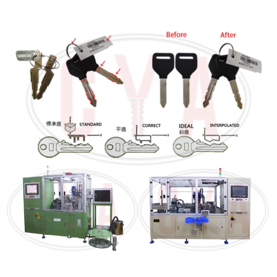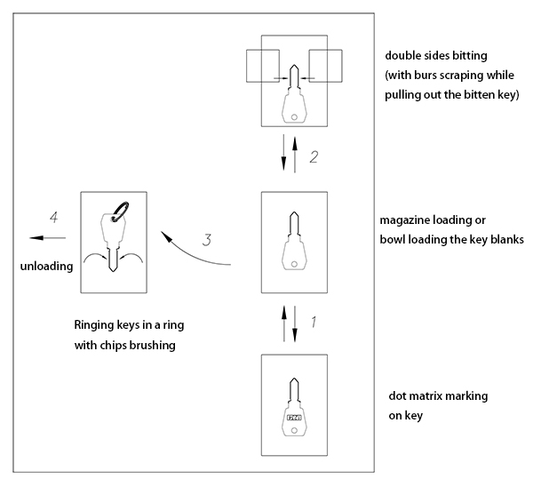 The main purpose of this machine is to do double side key-bit bitting on key blanks. It’s equipped with several other functions. The whole working processes are as below: 1.) magazine loading, 2.) dot matrix marking, 3.) double side bitting, 4.) burs scraping & chips brushing, 5.) ringing & un-loading to 6 box carousel. Above 5 functions can be designed in one machine by linear way transferring key blanks, and the cycle time can be deducted to 3 seconds for 5 key bits. If more functions such as camera checking, label printing (tag marking) and ringing with keys are required, the machine can be designed in clamp type by adding more clamps for each function station, but the cycle time will be longer than linear type.