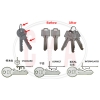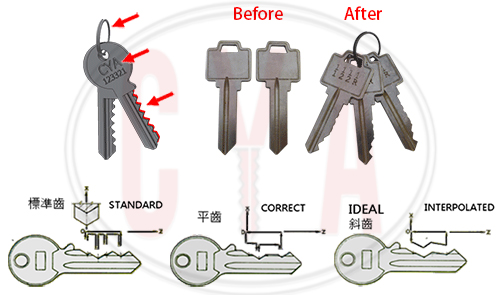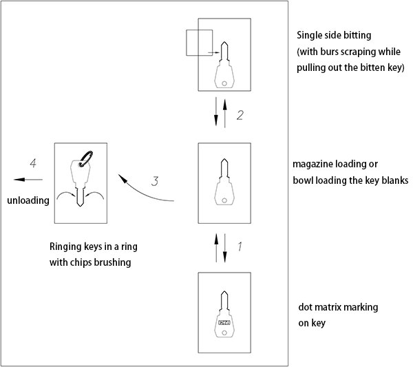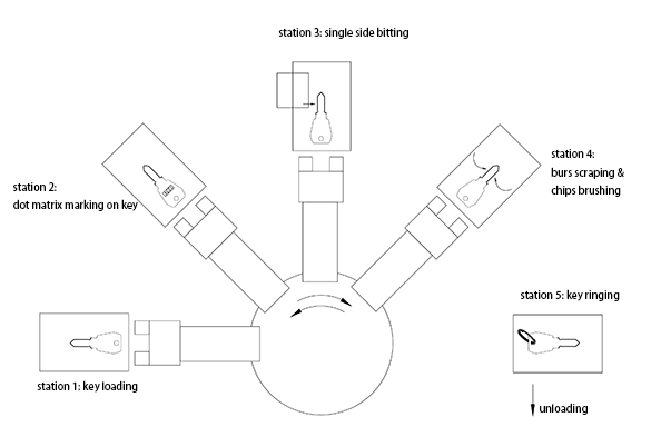 Above 4 mechanisms with 5 functions are made in a small space shown like the attached layout. The keys are transferred like the shown layout. So, the cycle time is very fast. However, due to the limit space, this type of machine can’t add more functions such as camera checking, tag marking, and ringing….