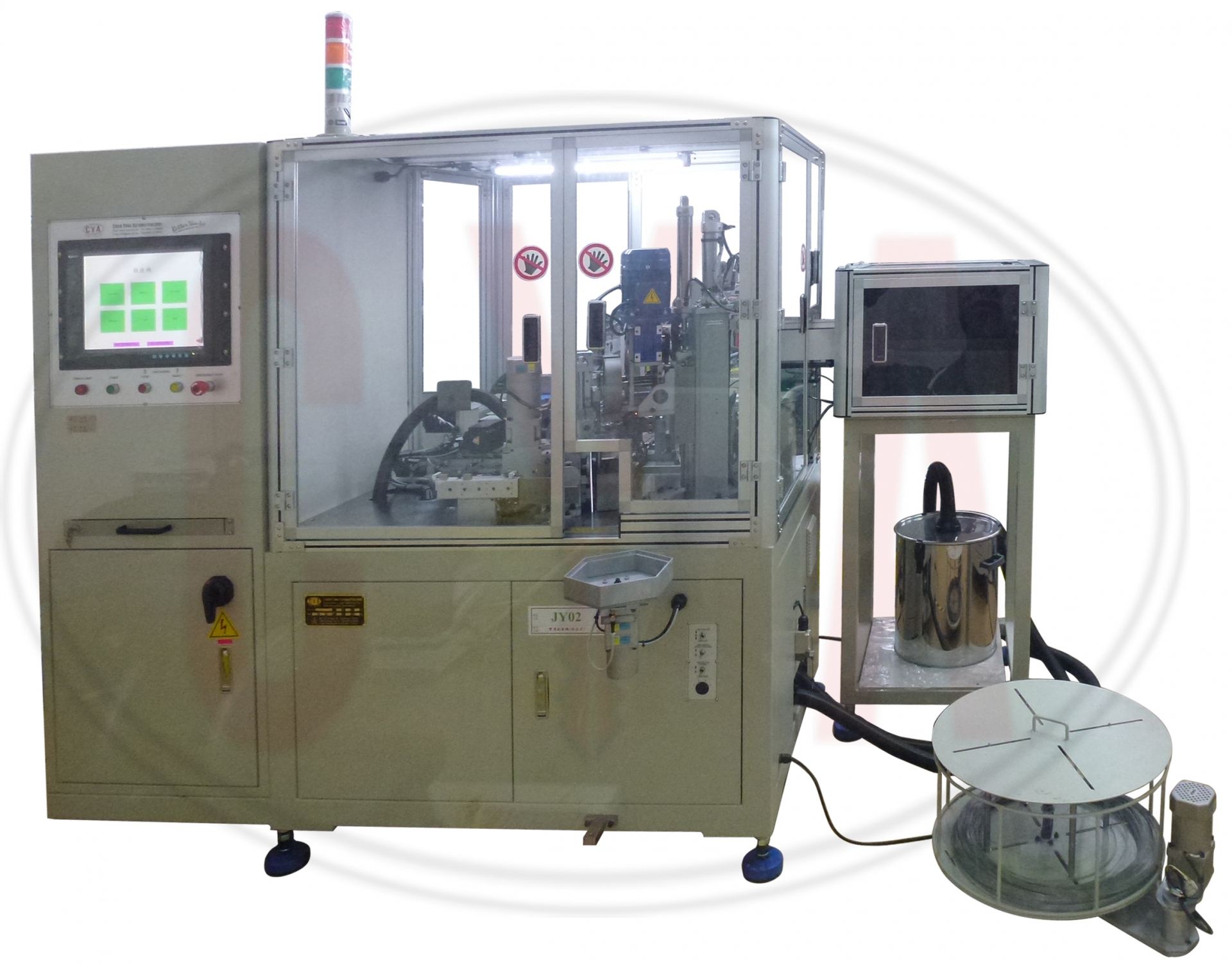This B100(index) machine is with a 6 stations index. It rotates every 4 seconds for each station working. Magazine loading or bowl feeding the key blanks into the fixture of the index as Station 1.