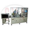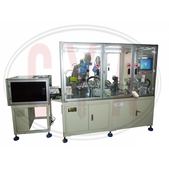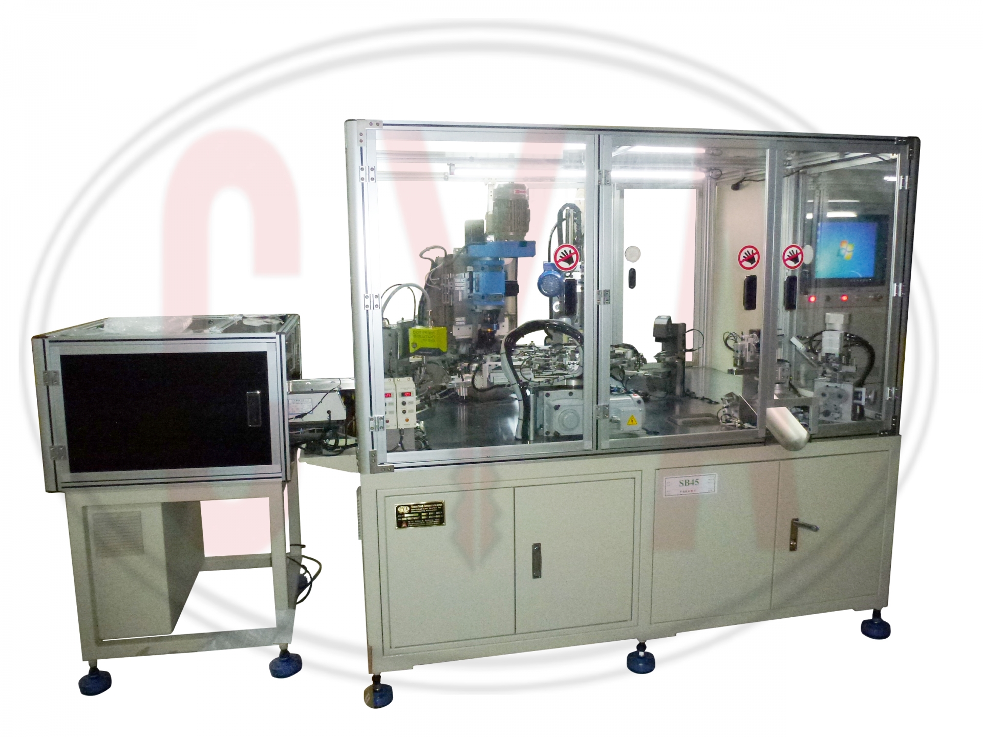 This machine is designed for lever key bitting. Bowl feeding with linear transfer to load the key into the clamp 1 on station 1. Totally, there are 4 clamps(moving forward and backward) transferring the key blanks between 5 stations(as the servo layout.) Station 2: Dot matrix marking on the keys. Station 3: X, Y axis for cutter bitting with key blanks(R axis) rotating. Station 4: Chip brushing. Station 5: Ringing key and un-loading. If the inspection for the finished keys is required, adding one more clamp with one more station can inspect the height of the bit and the corresponded codes. This machine will be 6 stations with 5 clamps.