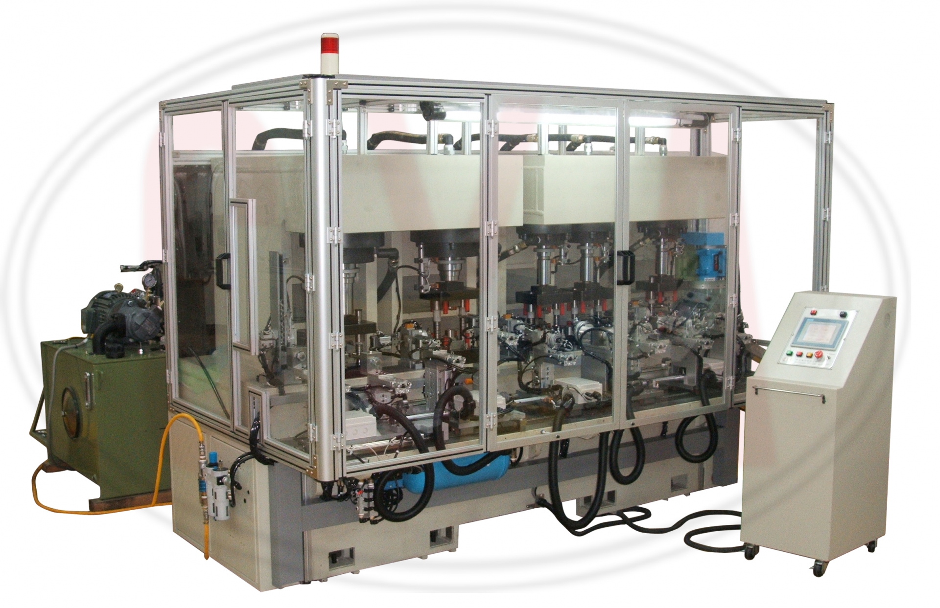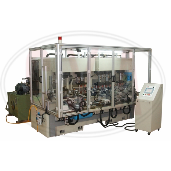 Shaft tube needs to have correct size and to be bent on some places. With auto-feeder, the shaft tubes are loaded into machine by magazine. There are 6 stations all with hydraulic power pressing the shaft tube in the mould for getting good diameter, cutting the excess part, bending somewhere….. Then, the finish shaft tube will be unloaded to the slide for unloading.