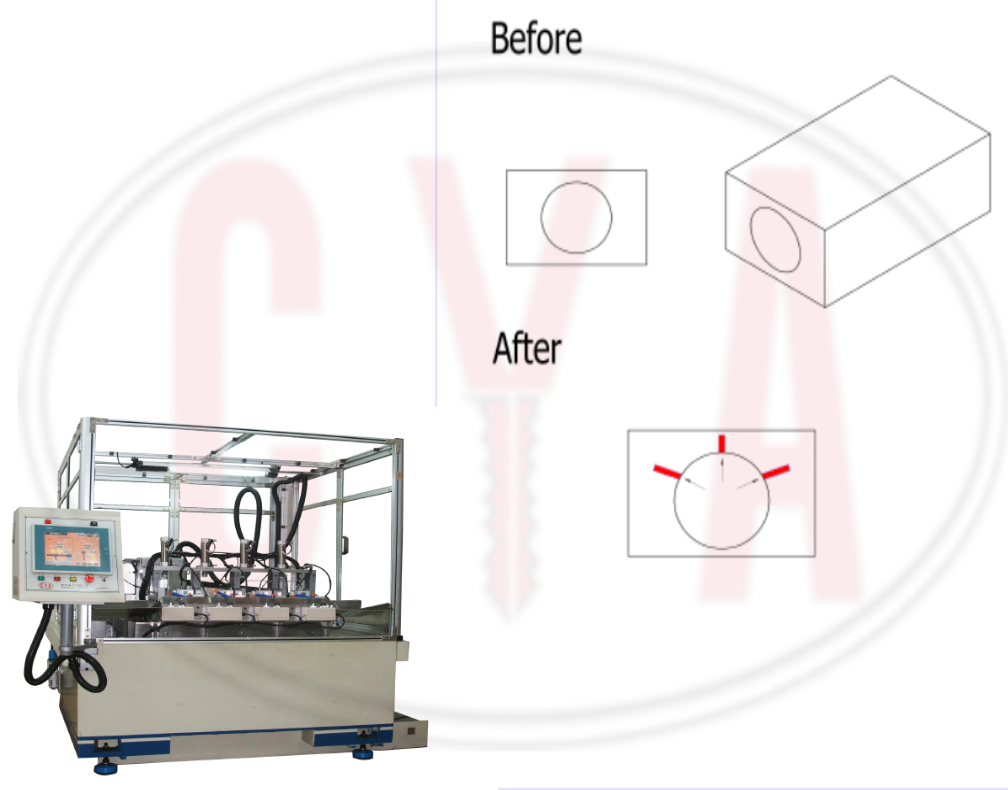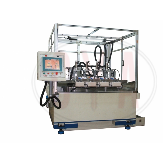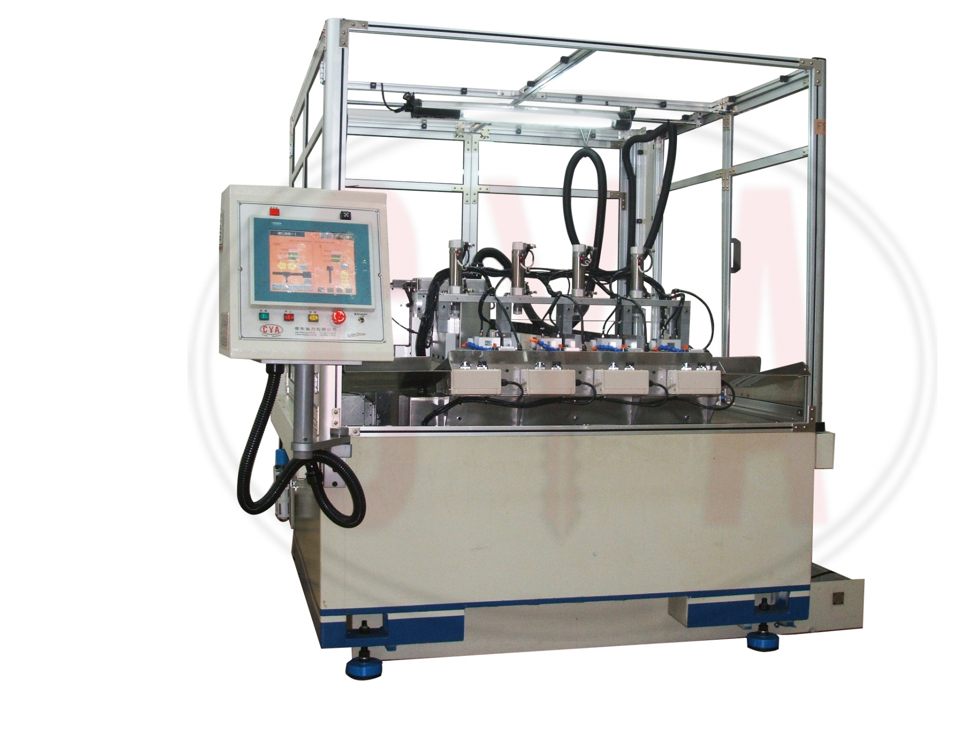There are 4 nests in this machine. They are fixed on the machine from lift to right in a linear way. And one drilling unit is installed on the rail way which is face to the 4 nests. Manual loading the body one by one to the 4 nests and lock it in position. The drilling unit will move to drill inside holes (rotating different degree ) on the first body in the 1st nest. The drilling work will be done in request from the 1st nest to the 4st nest. After the inside holes drilling work, manual unloads the finished body from each nest.
