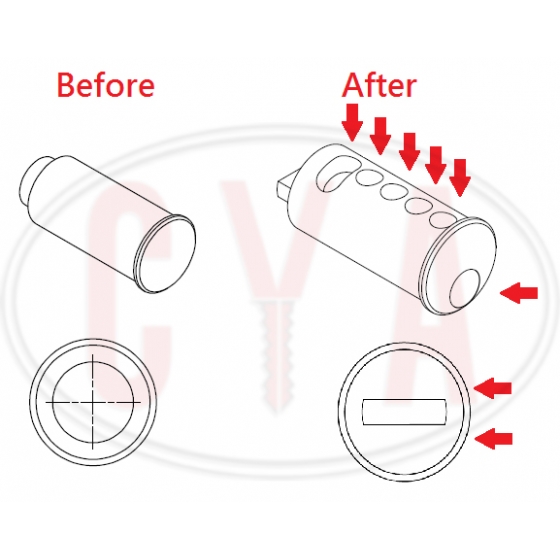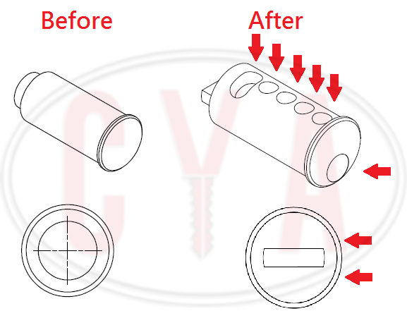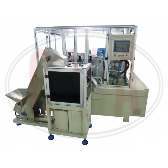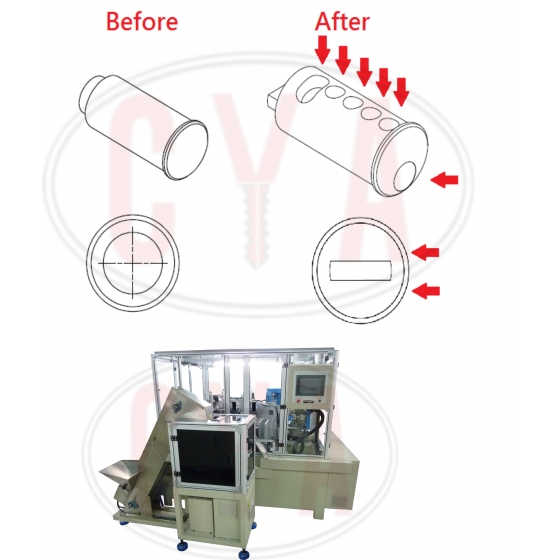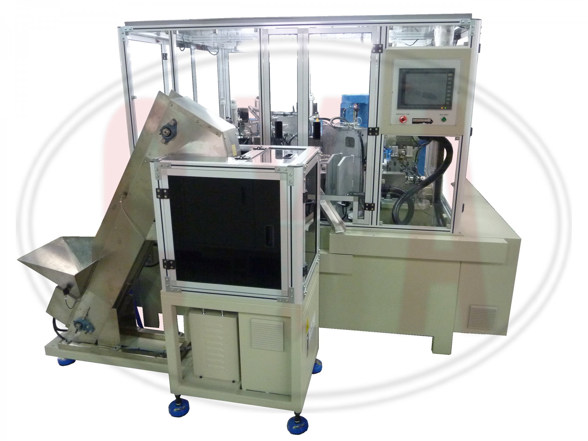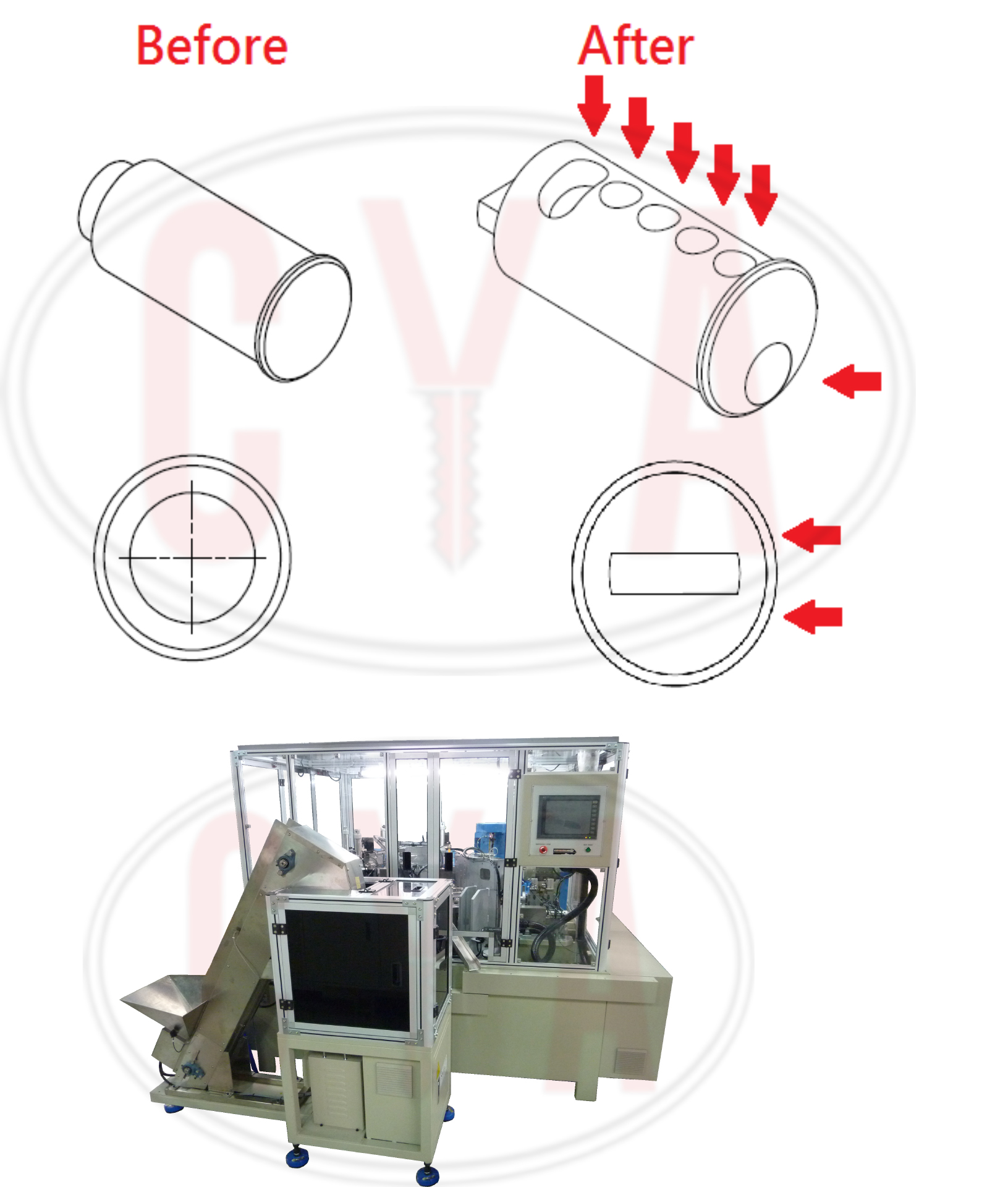 This automatic machine is designed for drilling pin holes of padlock’s barrel. The operator can load large amount of barrel blanks into auto feeding system and the machine will automatically transfer the barrels for drilling pin holes, milling actuator’s slot and retainer pin hole groove and milling coutersink hold. The finished barrels will be unloaded to the chute. A vibratory feeder bowl automatically feeds the screw machine blanks.