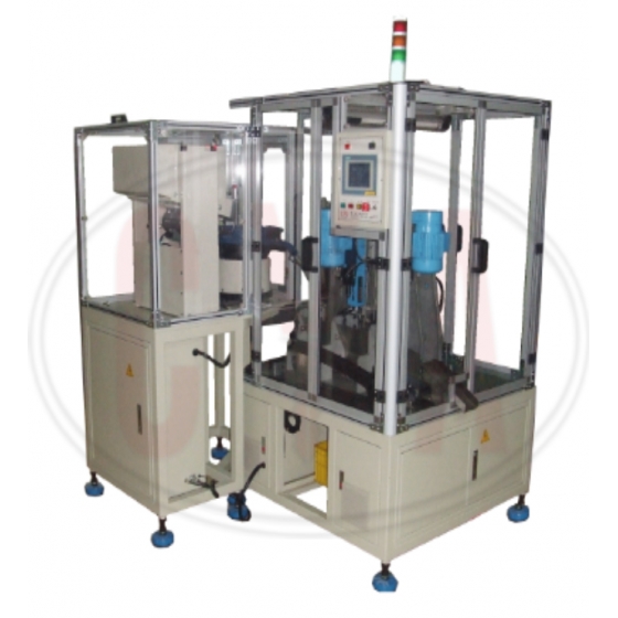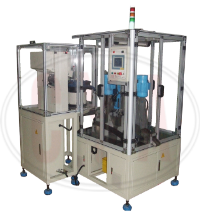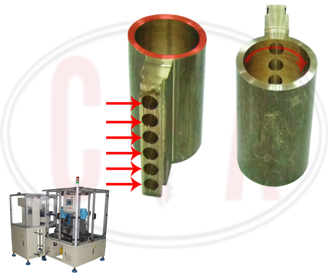 Bowl feeder with linear transfer loads the cylinder blank into the fixture. First spindle will do the reaming work on the barrel hole, and then the forming cutter can make the fine ring surface. Second spindle with servo motor will do the pinhole drilling work. Not only pitch of the pinhole, but also the depth of pinhole could be numeric controlled by HMI.
