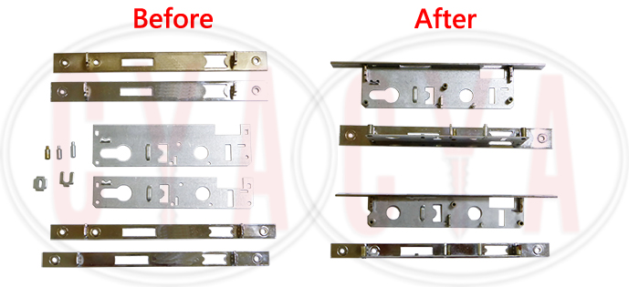 In the lock case, there are several pins and stoppers. Also, the face plate and the lock body belong to the lock case.