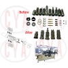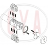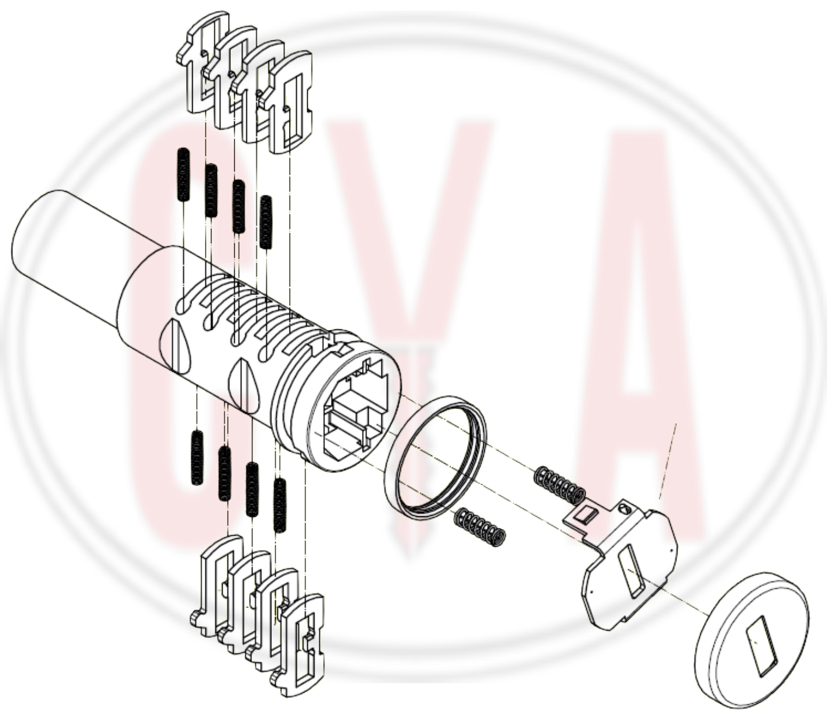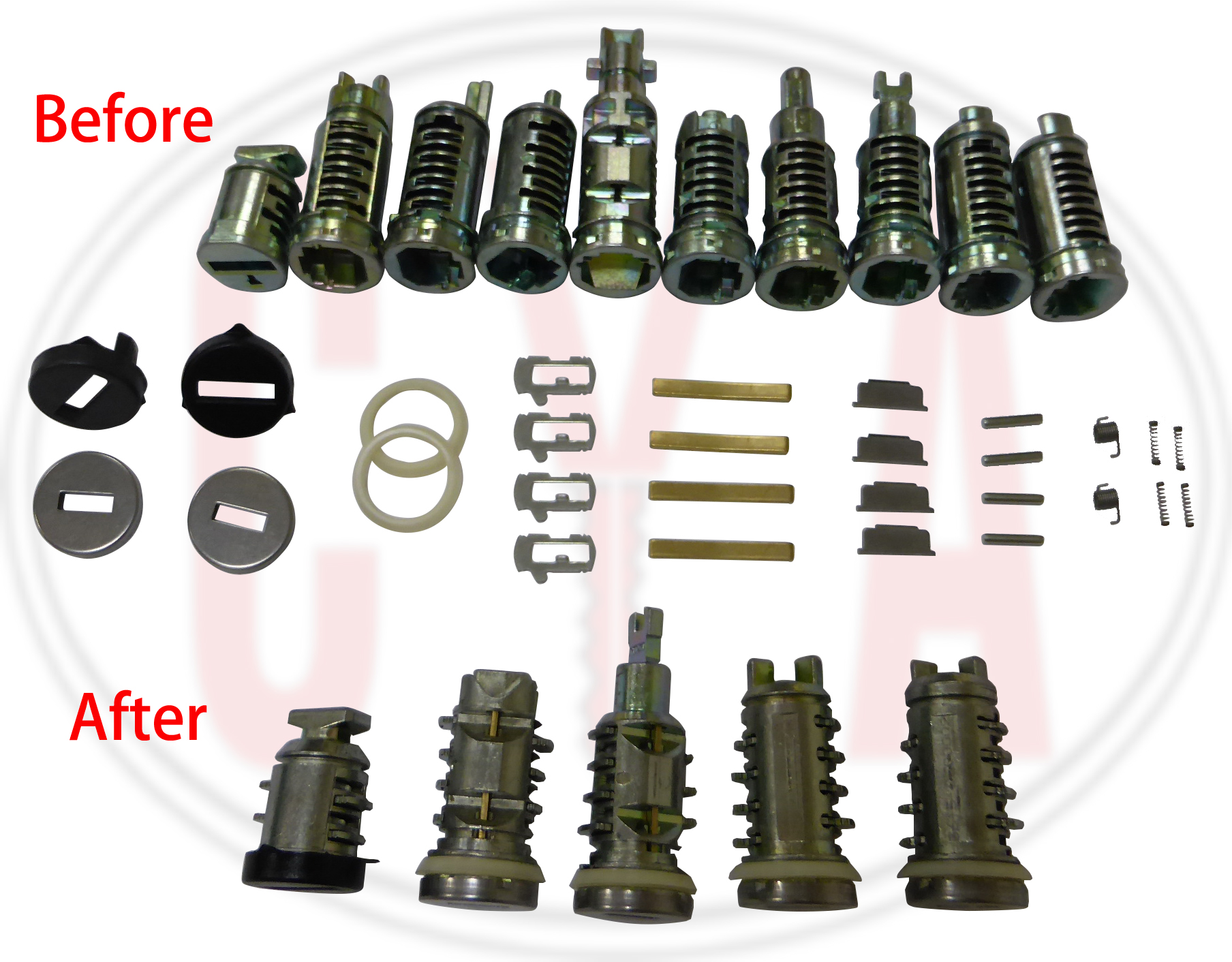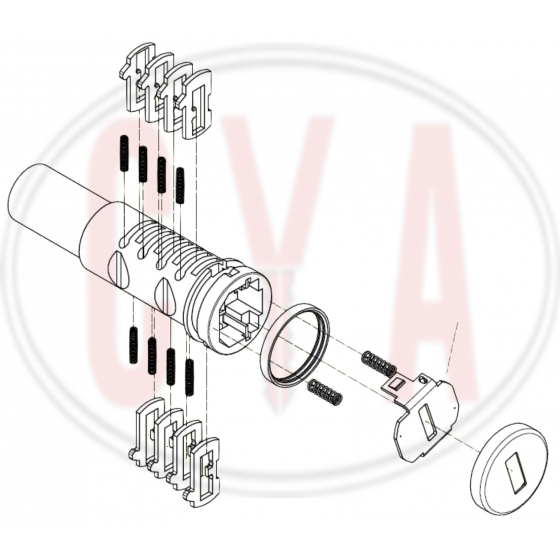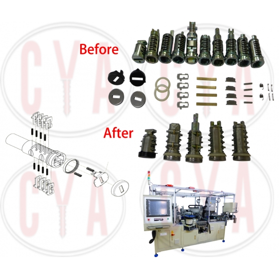 An operator manually loads the plug (barrel) and cut key into the respective nests. Vertical magazines automatically supply the wafers (tumblers) and a beehive type spring feeder automatically feeds the springs via plastic tubing. LVTD probes read the key cuts to determine the correct combination or a file provides the code information. Finished assemblies are automatically unloaded.