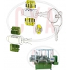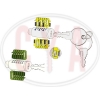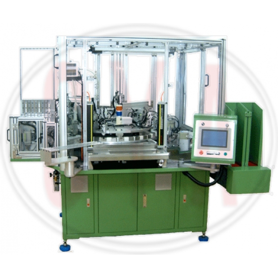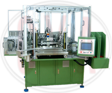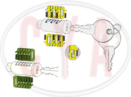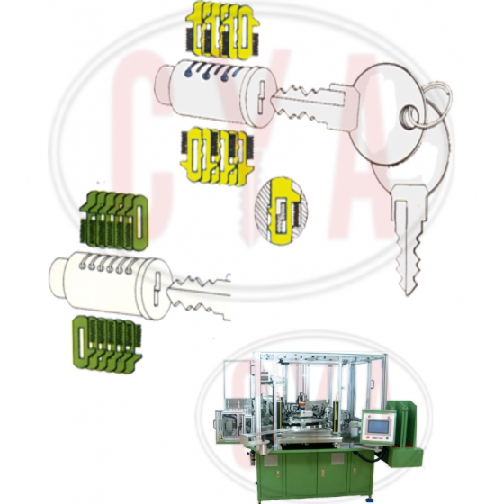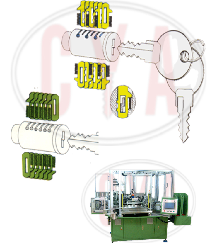 An operator manually loads the plug (barrel) and cut key into the respective nests. Vertical magazines automatically supply the wafers (tumblers) and a beehive type spring feeder automatically feeds the springs via plastic tubing. LVTD probes read the key cuts to determine the correct combination or a file provides the code information. Finished assemblies are automatically unloaded.