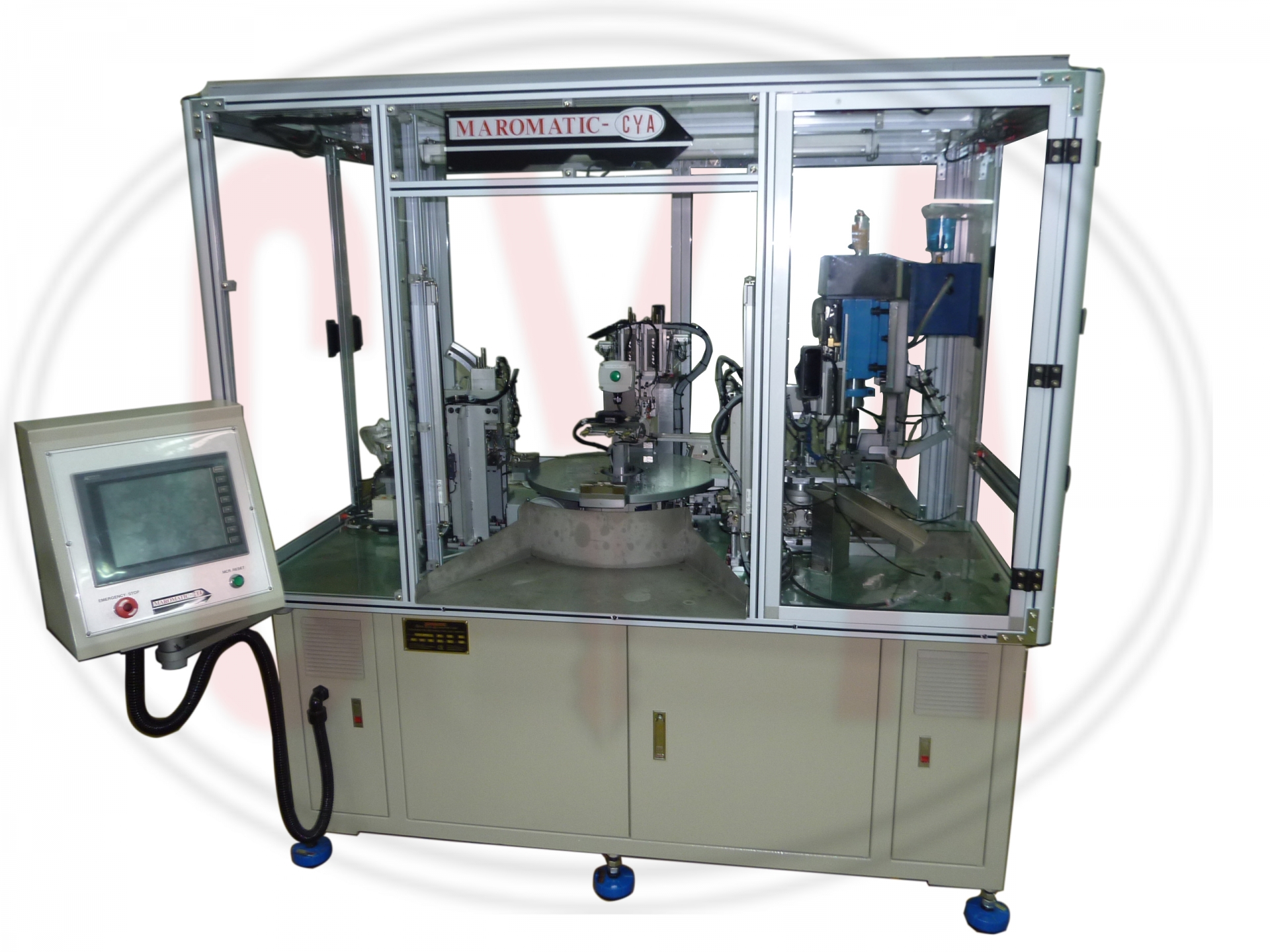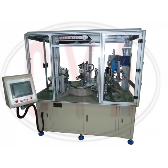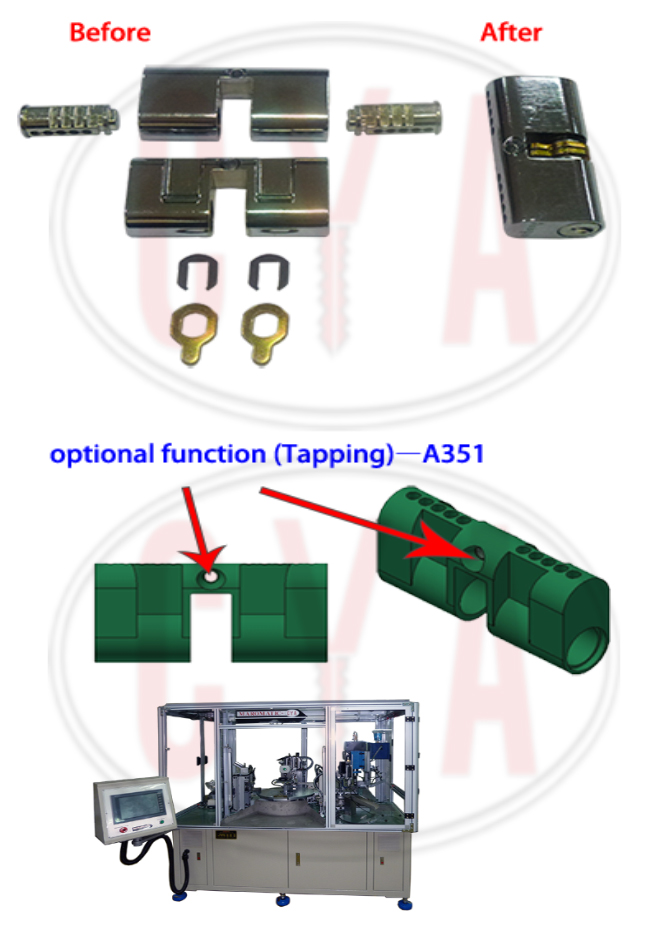 Cylinder pre-assembly machines add all components required (2 barrels, 2 cams, and 2 C-clips) prior to the pinning process. Depending on the design of the cylinders, the machines insert plugs (barrels) into housings, install cams, tail pieces, and retaining pins or retaining clips. An operator manually loads a housing and two barrel (right and left side). Vibratory feeder bowls automatically feed all necessary components. The final assembly is automatically unloaded into a chute. Machine A351 also adds the threaded mounting hole.