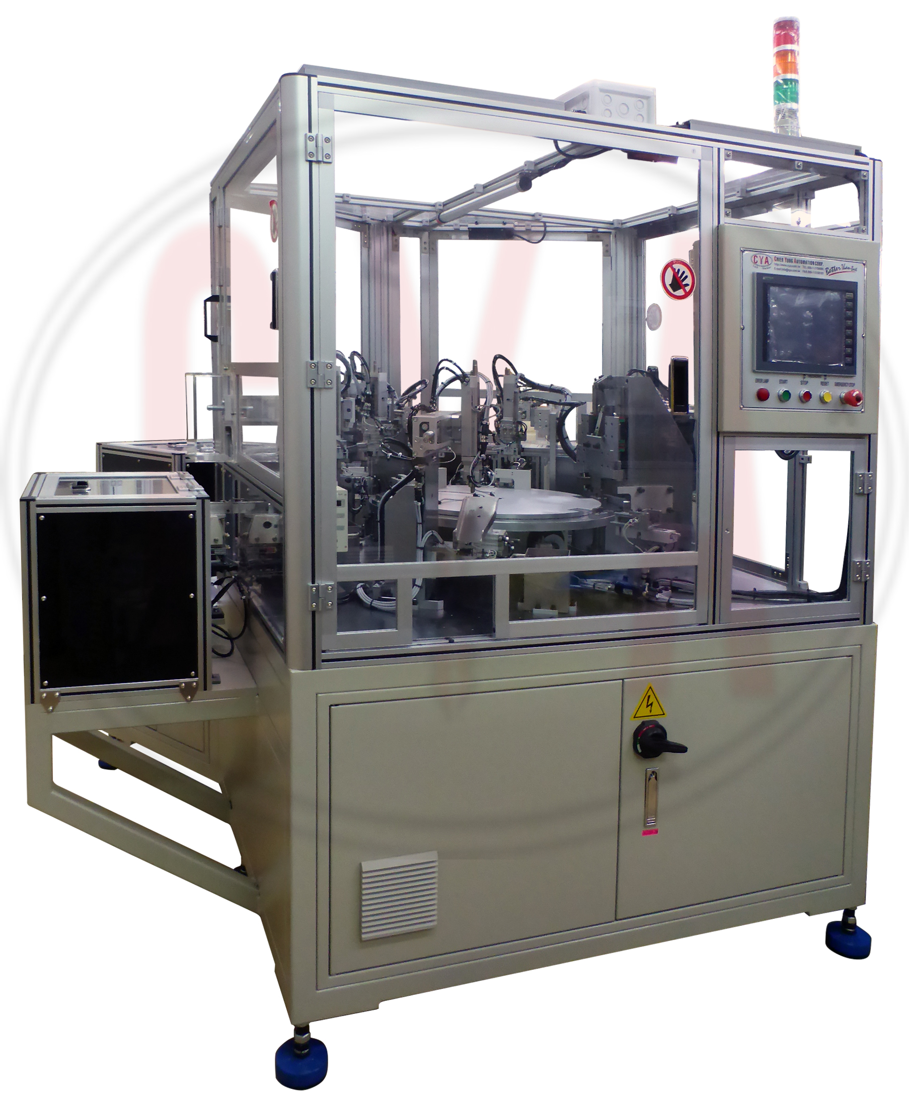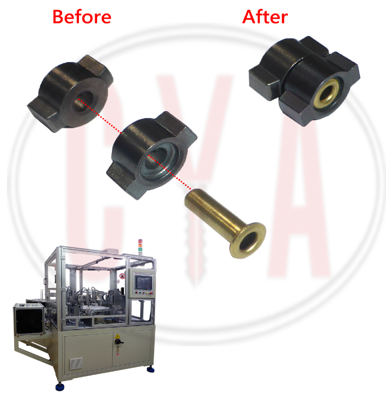 Cam pre-assembly machines assemble both the inside and outside cams for double-sided cylinders. With six stations, the machine is to assemble the 2 cams with the pins riveted. 2 cams are separately loaded into different station with different direction by bowl feeder. The pins are loaded through the 2 cams. Then the riveting station will rivet the pin within 2 cams. The inspecting station will follow to check the assembly is qualified or not. Then unload the finished Assembly.