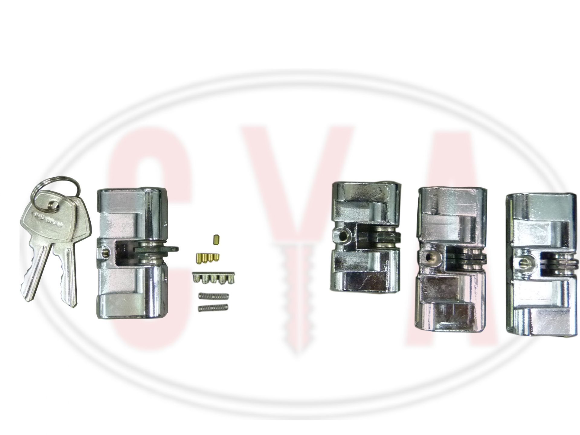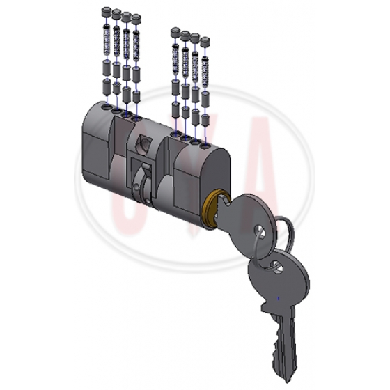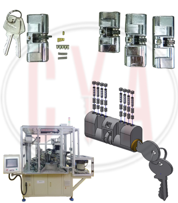 Double cylinder assembly machines automatically insert all bottom pins, top pins, springs, and closing pins into both sides of the double cylinder. Bottom pins and top (dumbbell) pins are loaded by auto feeders and springs by one spring box. An operator manually loads a cylinder inserted with cut key, a LVDT pins on next station will measure correct key numbers and later pin station will automatically load in corresponding bottom pins and top pins. Springs will be loaded on another station and checked whether they stay inside the pin holes. Alternately, the key codes may be obtained from a file. Customer can choose whether to use brass strip or brass pins to close the pin holes by hydraulic punching mechanism. Complete assembled cylinder can be checked if closed correctly and unload to the chute or to the operator when NG.