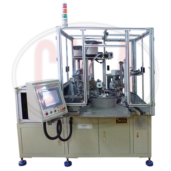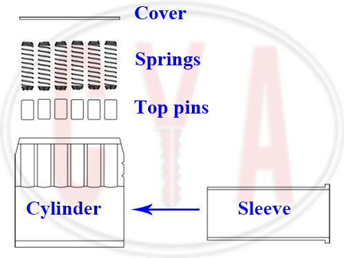Cylinder assembly machines automatically insert all top pins, sleeve, springs, and cover into a lock cylinder. It is without loading the combination pins (bottom pins), so keys are not used in this machine. After testing for proper parts load, the pin holes are closed using either a strip, a cover, or closing plugs. The finished assembly is for Lock Smith. An operator manually loads the empty cylinder into the machine station 1. All other parts are loaded through those auto-feeding systems. Assembled cylinders are automatically unloaded into a chute.