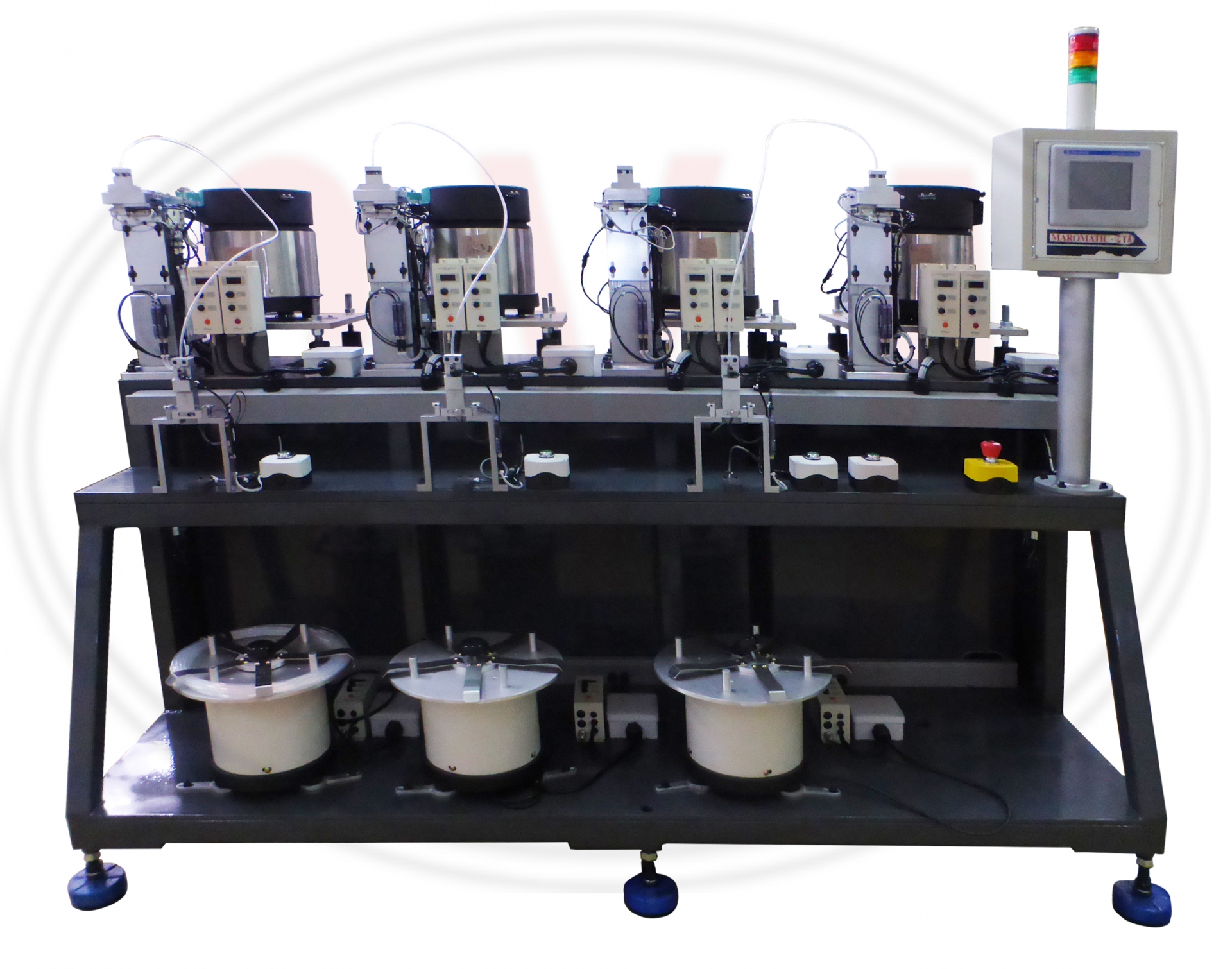 This machine is for feeding the top pins or bottom pins into tubes. Normally, a coil of tube is 100M long. If there are more than 20 bowl feeders in an assembly machine, the machine will vibrates. To avoid this, customers needs this pins in tube machine to pre-loading pins into a coil of tube. Several codes of pins can share one bowl for feeding into tubes. When the tubes are full of the pins, an operator puts the coil of pins on the assembling machine.